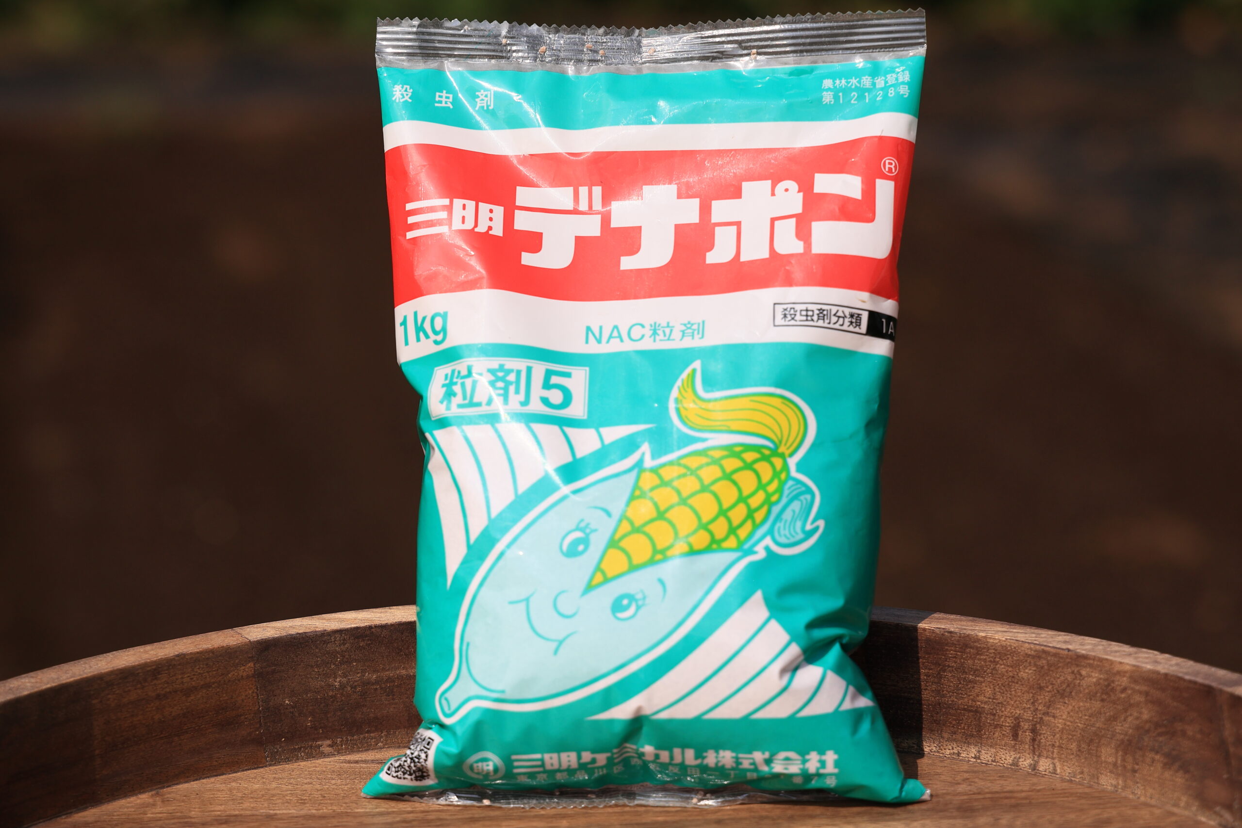 「三明デナポン粒剤5」(以下、デナポン)は、トウモロコシ専用の殺虫剤です。粒剤で撒きやすく、トウモロコシの天敵であるアワノメイガを効果的に退治してくれます!