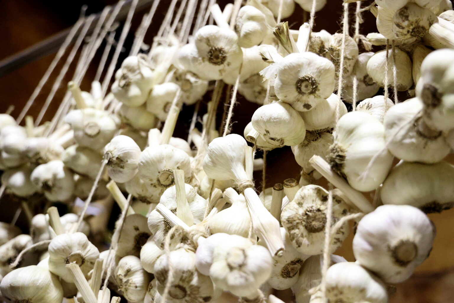 その後は葉茎や根を取り除き、直射日光が当たらない風通しのいい場所で保管しましょう。ちなみに、我が家では写真のように麻ひもで吊るして保管します。これで1年間は持つので、ニンニクの次作まで保管できることになり、年間を通じて食べることができますよ!