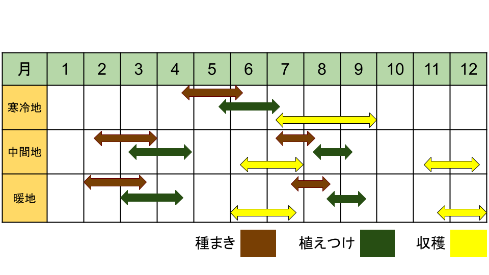 | 栽培適期(中間地) | 春作:3~4月植え/6月収穫 秋作:8~9月まき/11~12月収穫 |