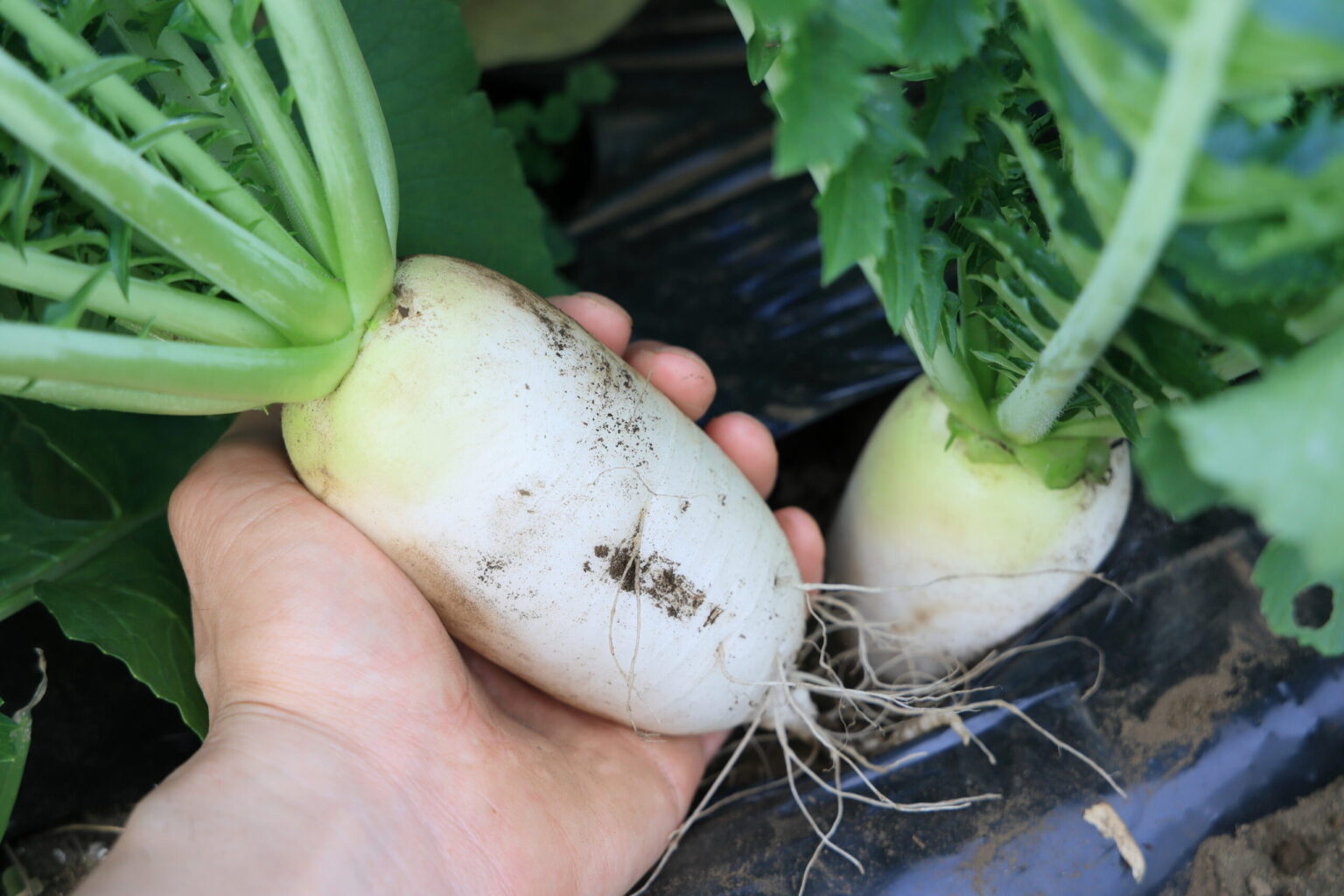 ころっ娘は根の太さが7cmほどになったら収穫適期!葉の根元をしっかり握って引き抜きましょう!